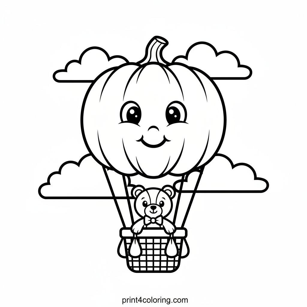 Imagine a giant, friendly pumpkin transformed into a whimsical hot air balloon! It floats gently through the sky, carrying a brave little teddy bear in its cozy basket. This enchanting scene is perfect for little artists to bring to life with vibrant colors, making Teddy's magical adventure truly unforgettable. What colors will you choose for the pumpkin and the sky?