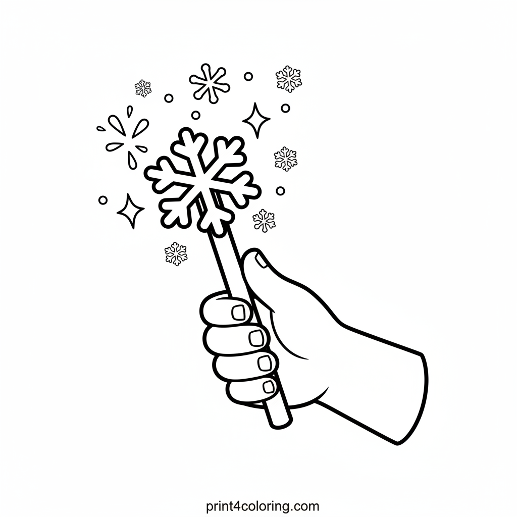 Imagine holding a magical snowflake wand! This enchanting page shows a child's hand gently waving a beautiful snowflake-shaped wand. Tiny, sparkling snowflakes begin to twinkle and float all around, filling the air with frosty magic. Bring this winter wonderland scene to life!