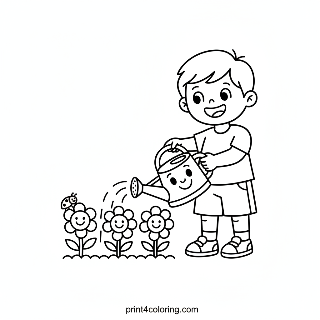 Join a happy child as they bring life to a garden with a friendly watering can! Watch the simple flowers bloom with joy and spot a tiny ladybug taking a stroll on a leaf. This delightful scene captures the simple pleasure of gardening and nature's small wonders. Perfect for little artists to color!