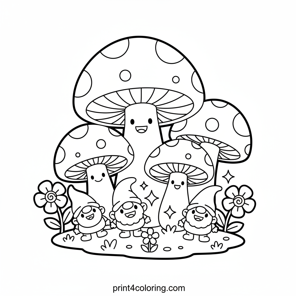Whimsical Gnome and Mushroom Garden Coloring Page
