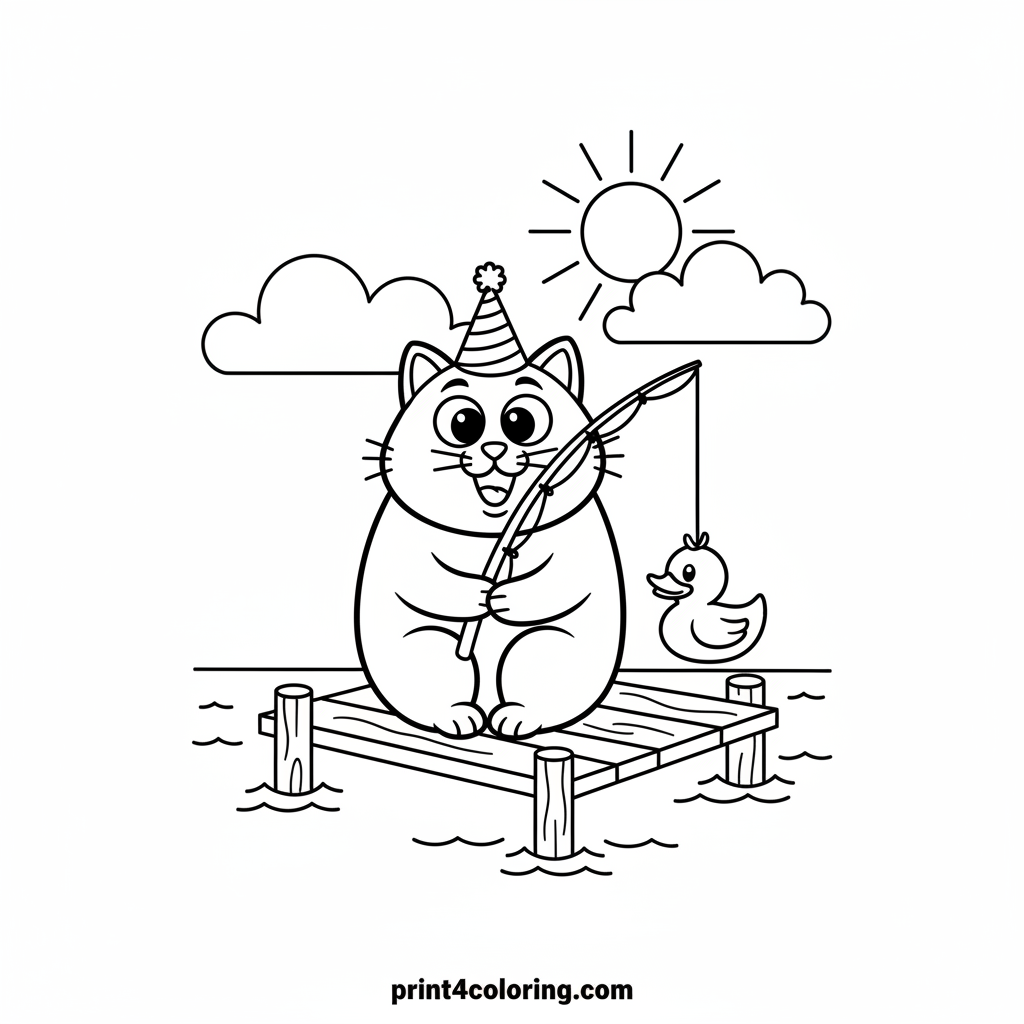 Join a charming cartoon cat, wearing an adorable tiny hat, as it enjoys a peaceful day fishing on a wooden dock. What a surprise! Instead of a fish, our feline friend has playfully reeled in a cheerful, smiling rubber duck. This comical scene is sure to bring giggles as you add vibrant colors to their funny adventure!