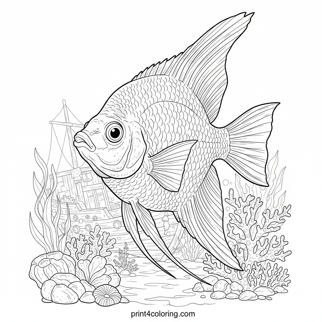 #angelfish#fish#shipwreck#underwater#ocean#coral#marine-life#detailed#expert#coloring-page#printable
