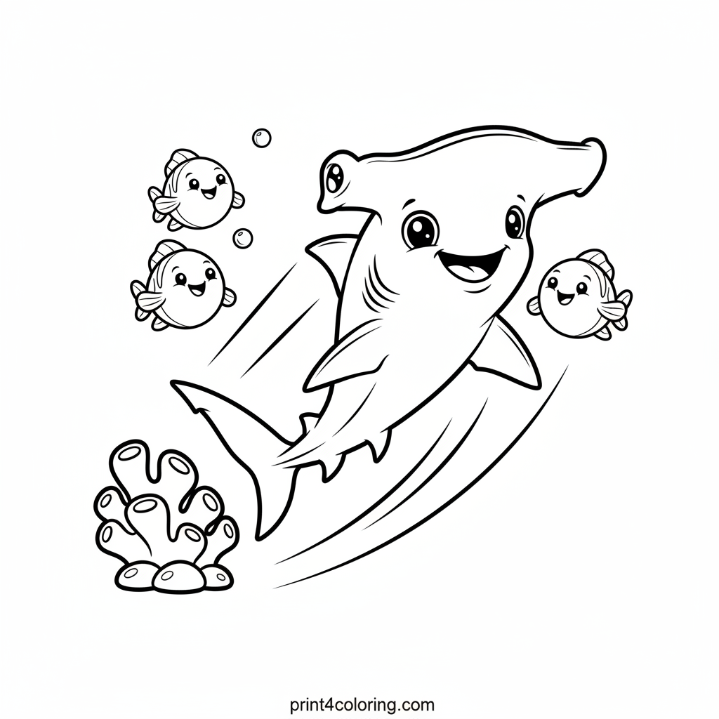 Dive into the deep blue with an adorable baby hammerhead shark on its very first swim! Watch as it gracefully glides past vibrant coral and friendly bubble fish, its unique hammer-shaped head tilted with wonder. This page is perfect for little explorers to color a fantastic underwater world.