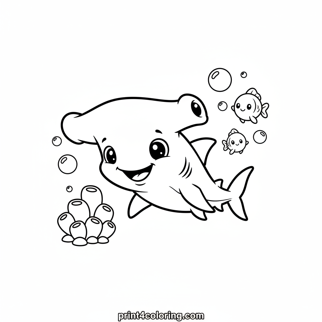 Dive into an underwater world with a charming baby hammerhead shark! Watch as it explores the vibrant coral reef for the very first time, its friendly eyes wide with wonder. Join the happy bubble fish in this exciting marine discovery and bring this delightful ocean scene to life with your favorite colors.