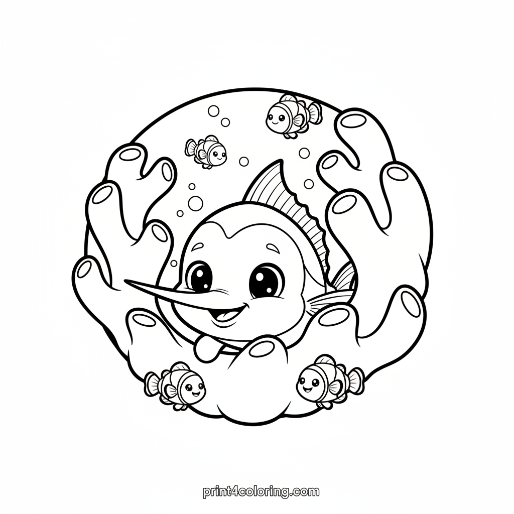 Dive into an underwater adventure with a cheerful baby marlin! Peeking from a vibrant coral hideaway, this friendly fish has big, happy eyes. He's surrounded by a school of tiny, smiling clownfish, making for a cozy and delightful ocean scene. Grab your crayons and bring this colorful world to life!