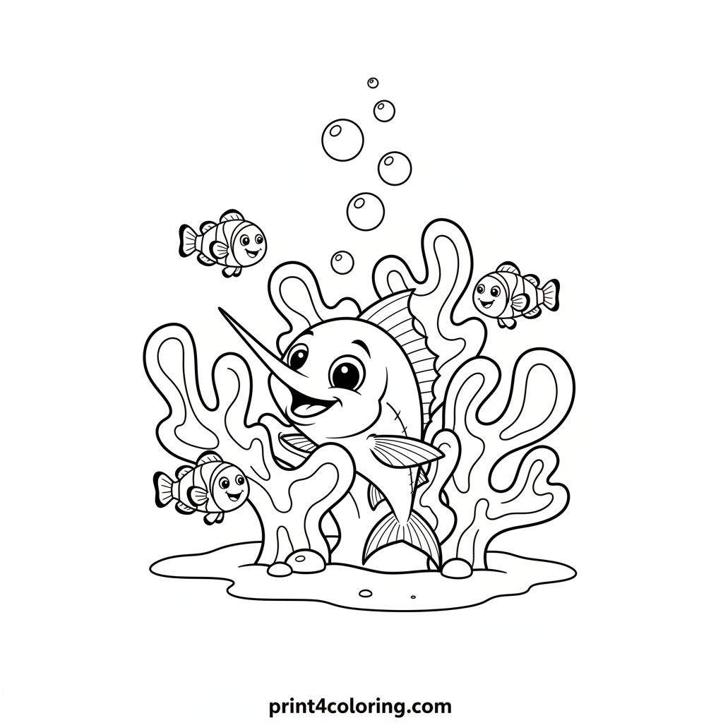 Dive into an underwater world! This adorable coloring page features a happy baby marlin with big, friendly eyes, playfully peeking from behind a beautiful coral reef. Tiny, smiling clownfish swim nearby, ready for you to bring this vibrant ocean scene to life with your favorite colors. A perfect adventure for young artists!