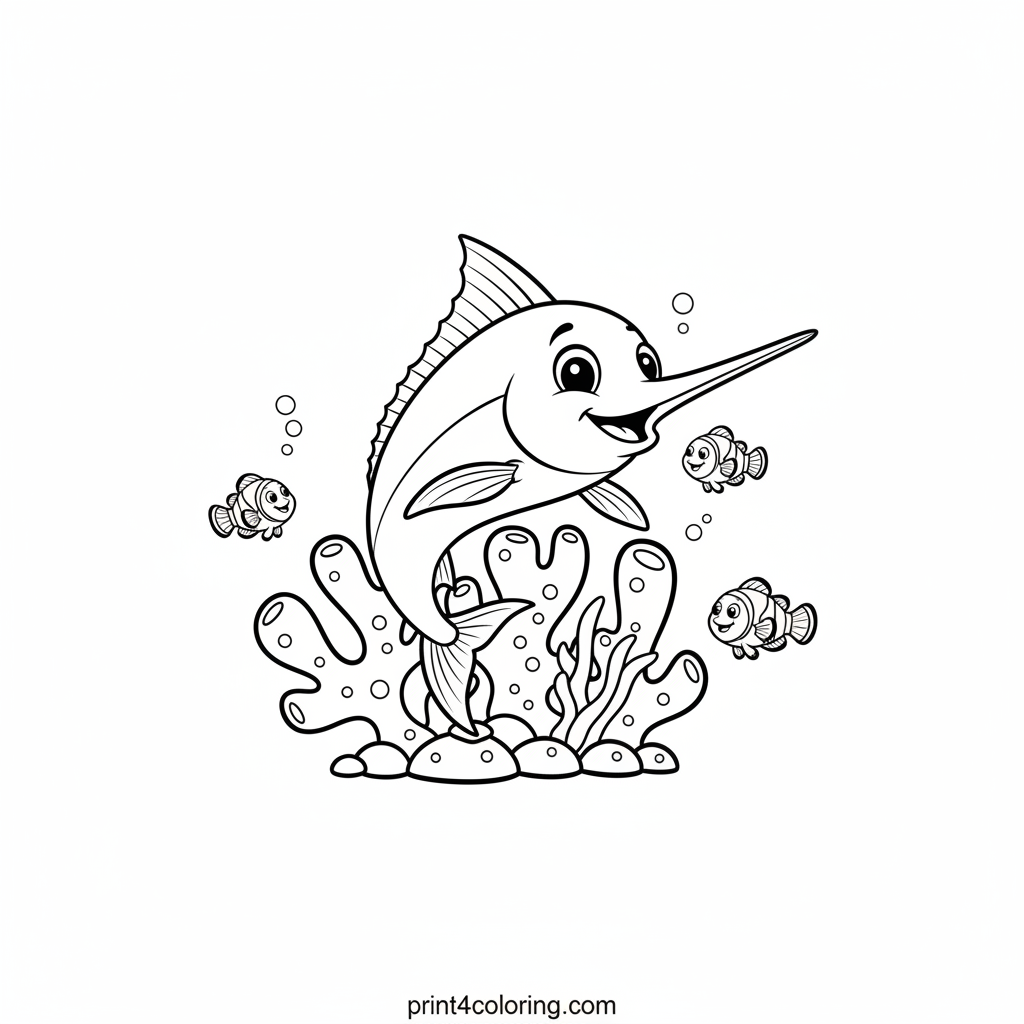 Dive into an ocean adventure with a cheerful baby marlin! This friendly little fish, with its big, kind eyes, is playfully peeking out from a colorful coral hideaway. Surrounding him are tiny, smiling clownfish, making this underwater scene a joyful spectacle. Grab your crayons and bring this vibrant marine world to life!