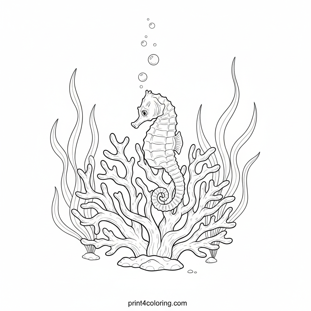 Dive into an expert underwater coloring adventure! This page features a tiny, delicately detailed baby seahorse, its tail gently curled around intricate branching coral. Surrounded by small, realistic bubbles and swaying seaweed, this scene offers fine lines and challenging details for a truly rewarding coloring experience.