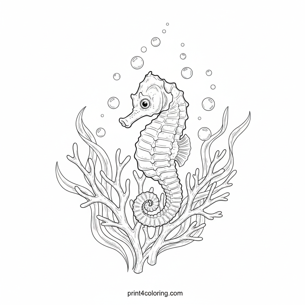 Dive into an enchanting underwater world! This detailed coloring page features a tiny baby seahorse, its delicate tail gently curled around intricate branching coral. Surrounded by realistic bubbles and swaying seaweed, this scene invites young artists to explore the wonders of the ocean and bring its beauty to life with vibrant colors.
