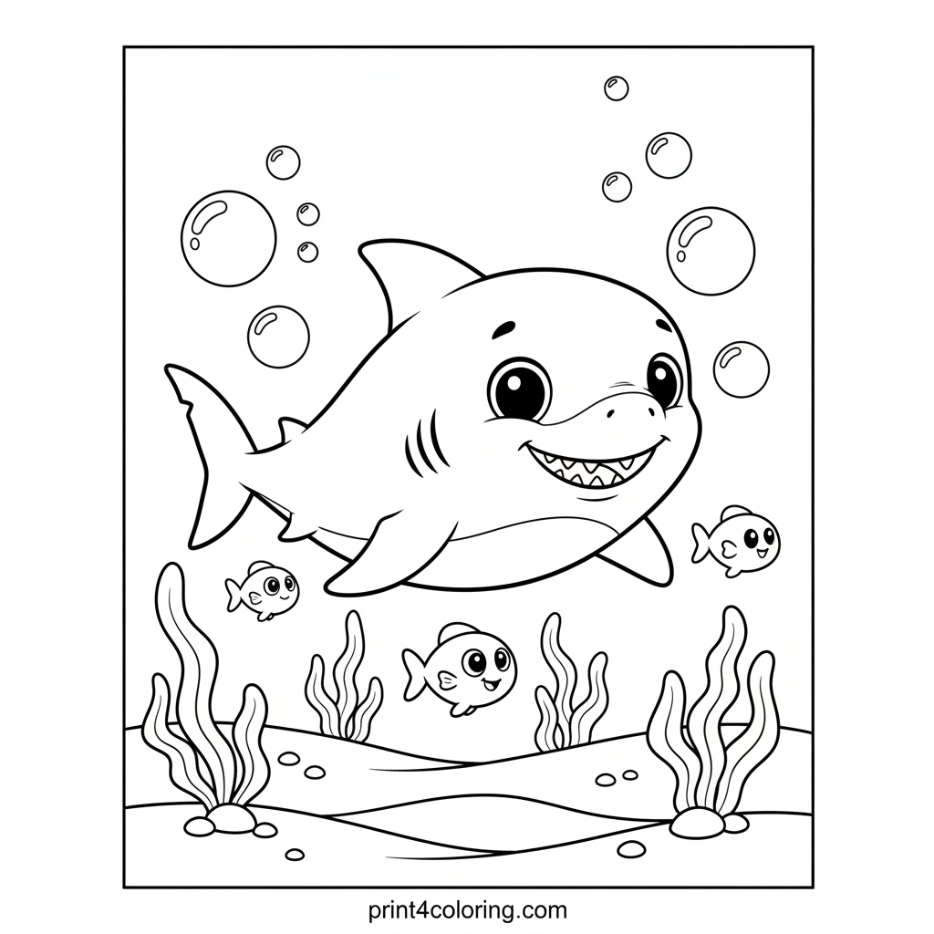 Dive into the ocean with this adorable baby great white shark on its very first swim! With big, friendly eyes and a happy smile, our little shark explores a wondrous, bubbly underwater world. Watch as a few small, colorful fish playfully swim nearby, making this scene a delightful adventure for young artists to bring to life.
