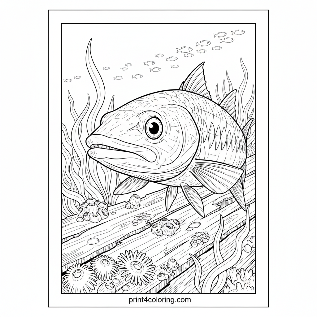 #barracuda#shipwreck#underwater#ocean#marine-life#fish#deep-sea#detailed#coloring-page#printable