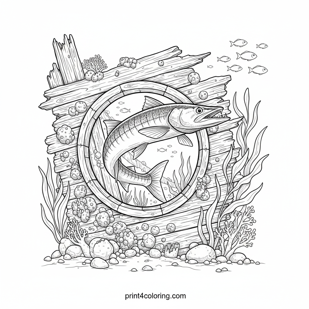 Barracuda's Sunken Shipwreck Exploration Coloring Page