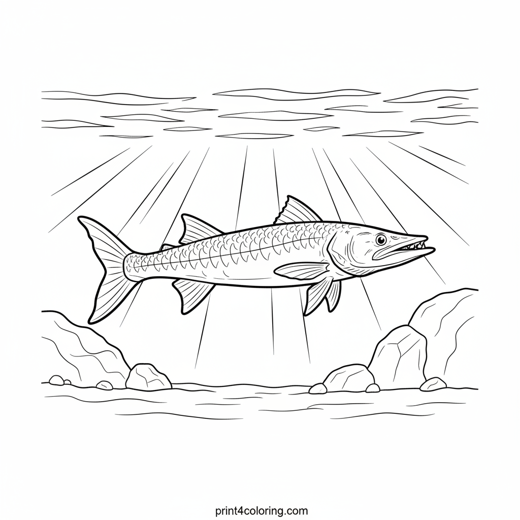 Embark on an underwater adventure! This expert coloring page features a sleek barracuda gracefully swimming through sun-dappled ocean waters. Its streamlined body, detailed fins, and scales are highlighted by shimmering light rays and distant rock formations. A captivating scene awaiting your artistic touch.