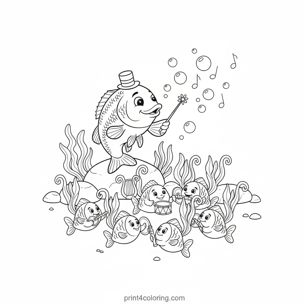 Dive deep into a delightful underwater world where Maestro Bass, with his tiny hat and baton, conducts a charming orchestra of friendly fish! Watch as minnows play instruments made of seaweed and bubbles, creating a magical symphony. This whimsical scene is perfect for little artists to bring to life with vibrant colors and imagination.