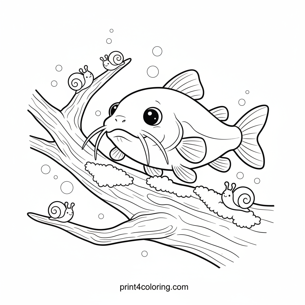 #catfish#underwater#river#nature#aquatic#snails#sunken branch#cozy scene#fish#coloring-page#printable