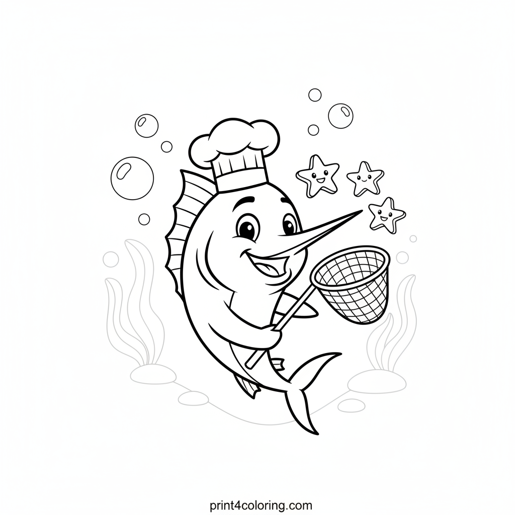 Join Chef Marlin in his bubbly underwater kitchen! Wearing a tiny hat, this cheerful marlin is on a playful snack hunt, 'fishing' for tasty seaweed with his net. Friendly sea plants surround him as he prepares his feast. Grab your crayons and add vibrant colors to his delicious deep-sea adventure!