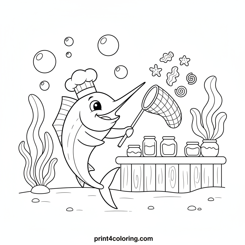 Join Chef Marlin on an amazing underwater snack hunt! This cheerful marlin, sporting a tiny chef's hat, is playfully 'fishing' for delicious seaweed treats with his net. Dive into a whimsical deep-sea kitchen filled with bubbles, friendly sea plants, and tasty snacks. A delightful scene for all young artists to color!