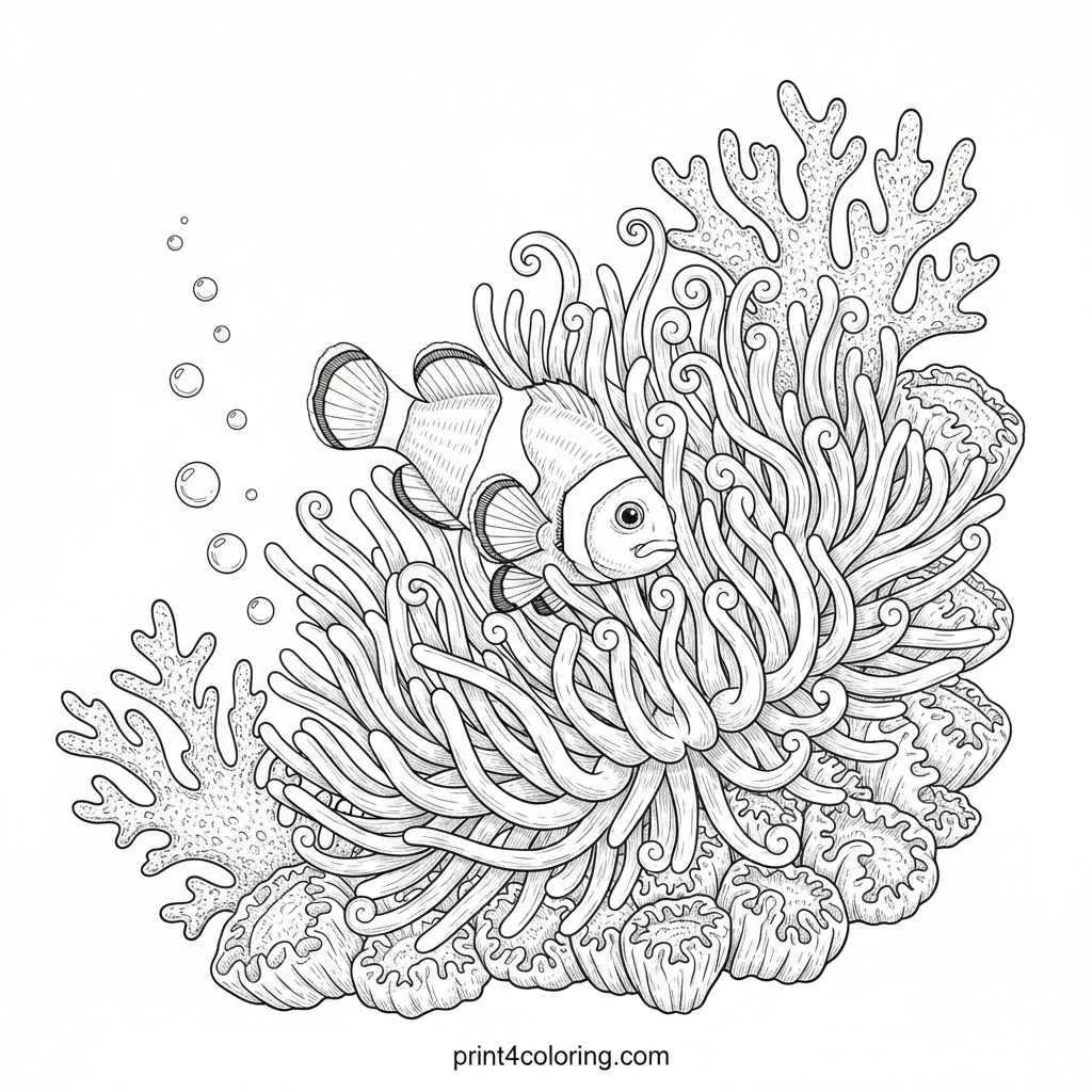 Dive into an expert coloring challenge! Bring to life a vibrant clownfish nestled deep within its magnificent sea anemone home. Explore the intricate textures of flowing tentacles, detailed coral formations, and delicate air bubbles in this underwater adventure. Perfect for advanced colorists!