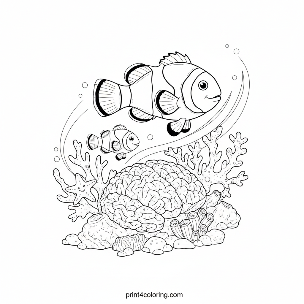Explore the vibrant coral reef with a playful clownfish duo! See two graceful clownfish, one slightly larger, darting between colorful coral branches or investigating a friendly starfish. This scene captures gentle underwater movement and interaction, perfect for bringing to life with your brightest colors!