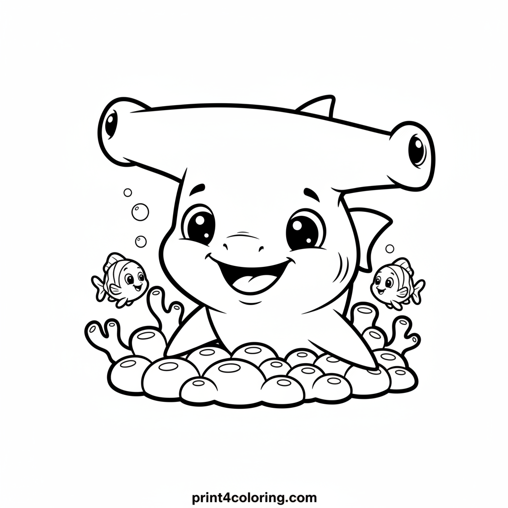 Dive into an underwater adventure with this adorable baby hammerhead shark! With big, friendly eyes and a curious tilt to its unique head, it explores a vibrant coral reef. Accompanying it are playful bubble fish, making its very first swim a delightful discovery. A charming scene for young ocean lovers!