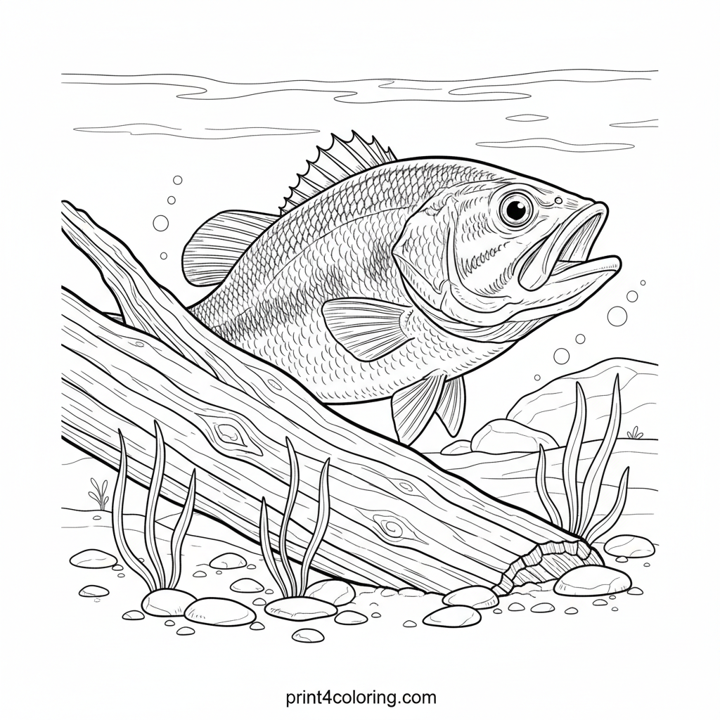 #bass#fish#underwater#log#nature#aquatic#scales#curious#coloring-page#printable