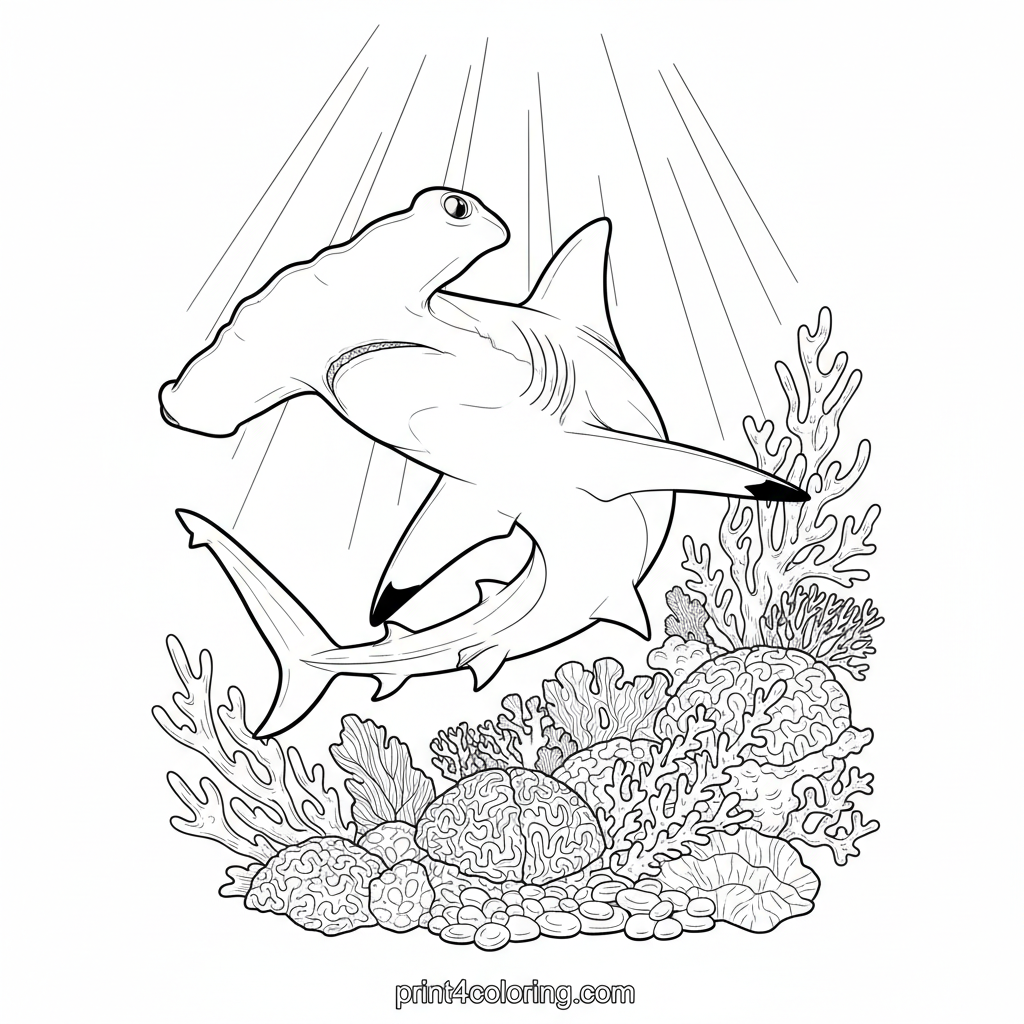 Dive deep into the ocean's wonders with a curious hammerhead shark! This detailed scene captures the magnificent shark gently exploring a vibrant coral reef, filled with intricate brain, fan, and branching coral. Imagine the beautiful colors you can bring to this underwater world, with sunlight shimmering through the waves.