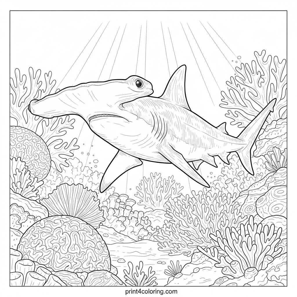 #hammerhead-shark#coral-reef#ocean-life#underwater#marine-animals#detailed#nature#coloring-page#printable