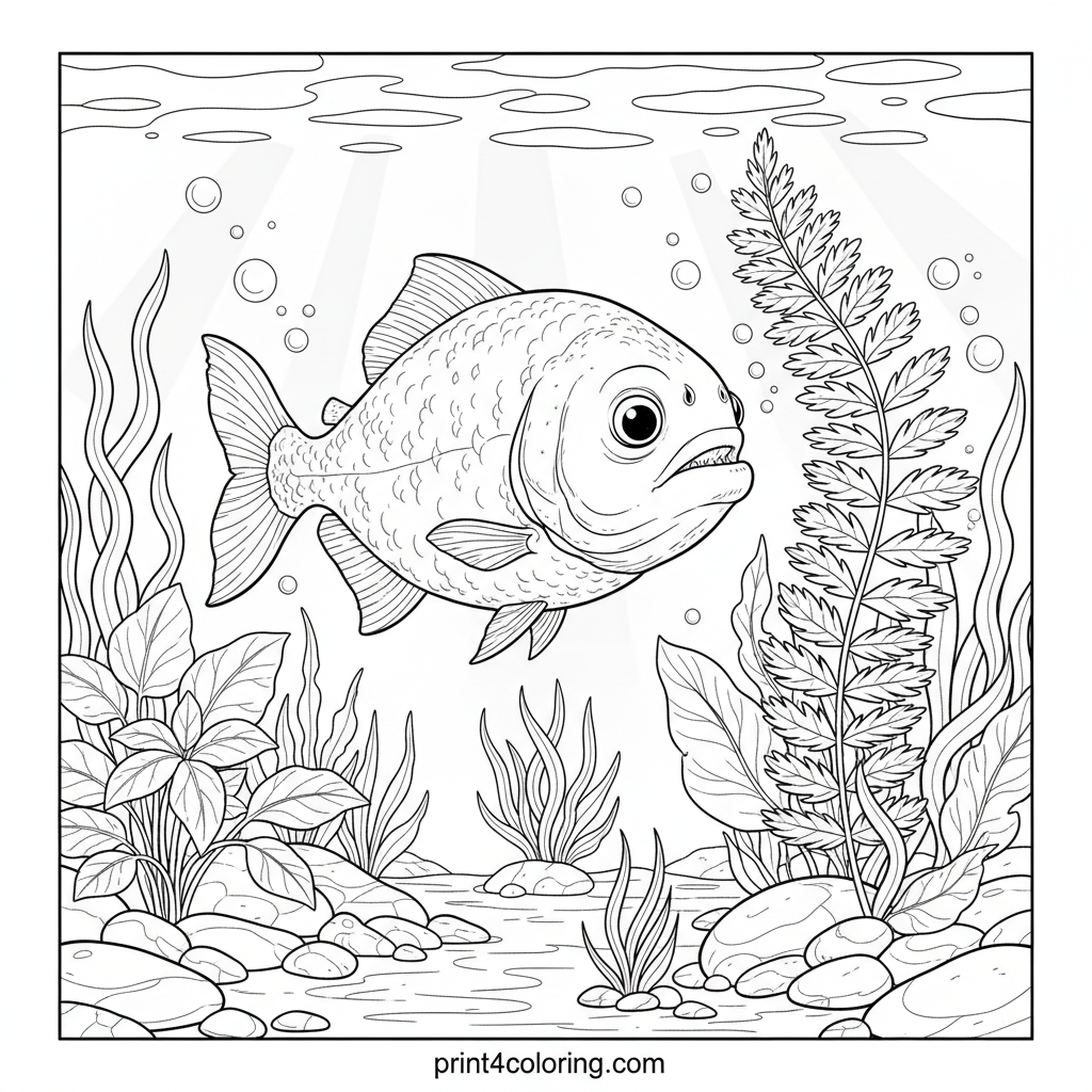 Dive into an exciting underwater world! Join a young, curious piranha with big, observant eyes as it gently explores a vibrant river garden. Color the detailed aquatic plants, smooth river stones, and the dappled light filtering through the water. Imagine the thrill of discovering new wonders in its fascinating aquatic home.
