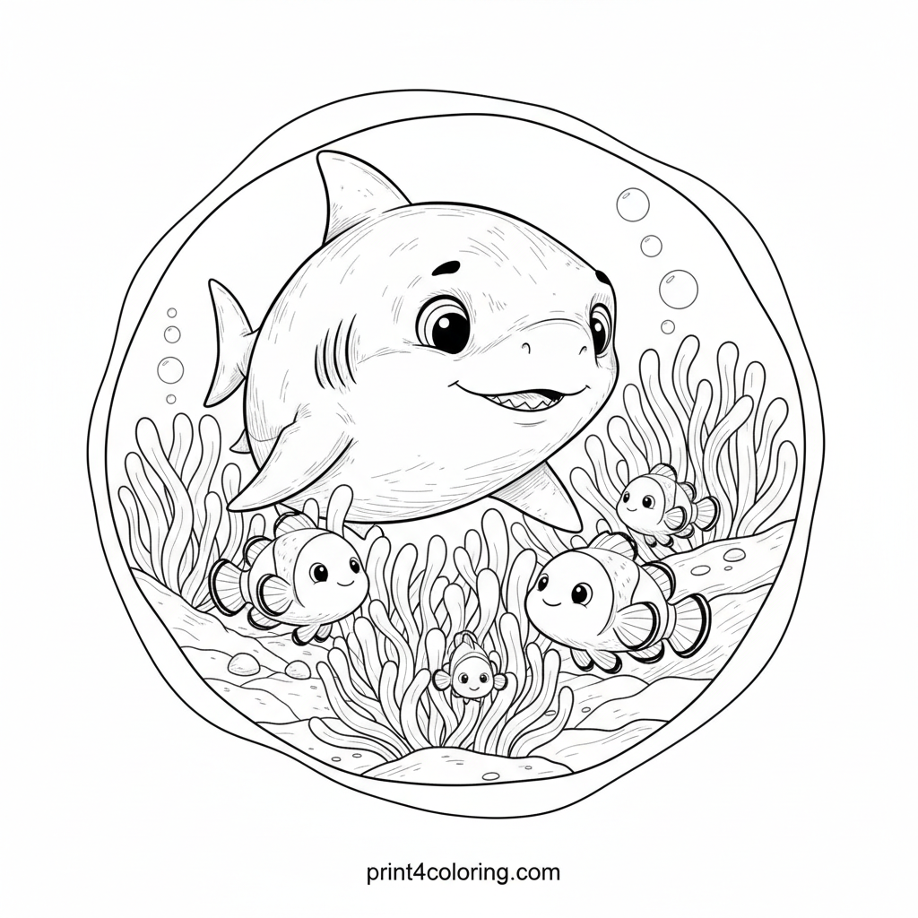 Dive into a captivating underwater scene where a gentle, young great white shark, with an inquisitive gaze, peacefully observes a vibrant cluster of sea anemones. Witness tiny, harmless clownfish swimming gracefully among their tentacled homes. This detailed coloring page invites you to imagine a harmonious ocean world, full of wonder and discovery.