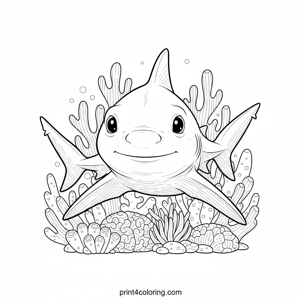 Dive into an underwater adventure with this detailed coloring page featuring a gentle reef shark pup. Explore the intricate textures of its vibrant coral home as the curious shark gracefully swims by. This peaceful scene invites you to bring the wonders of the ocean to life with your colors, highlighting smooth skin and delicate fins.