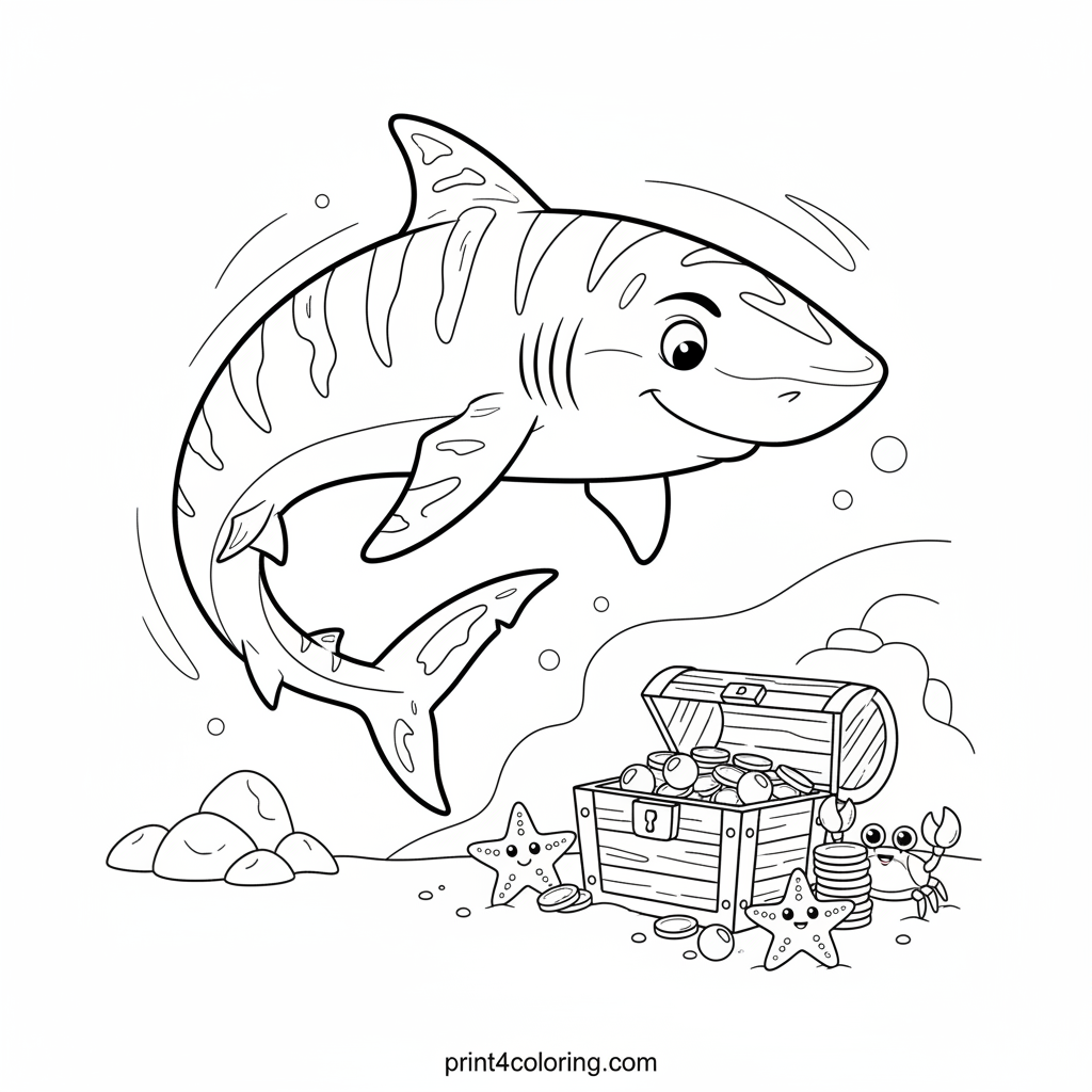 Dive deep with our friendly tiger shark as it discovers a hidden treasure chest! With its unique stripes, this gentle giant is carefully investigating ancient gold coins and sparkling jewels. Watch out for the playful starfish and the shy crab peeking from behind the chest. A fun underwater adventure awaits your colors!