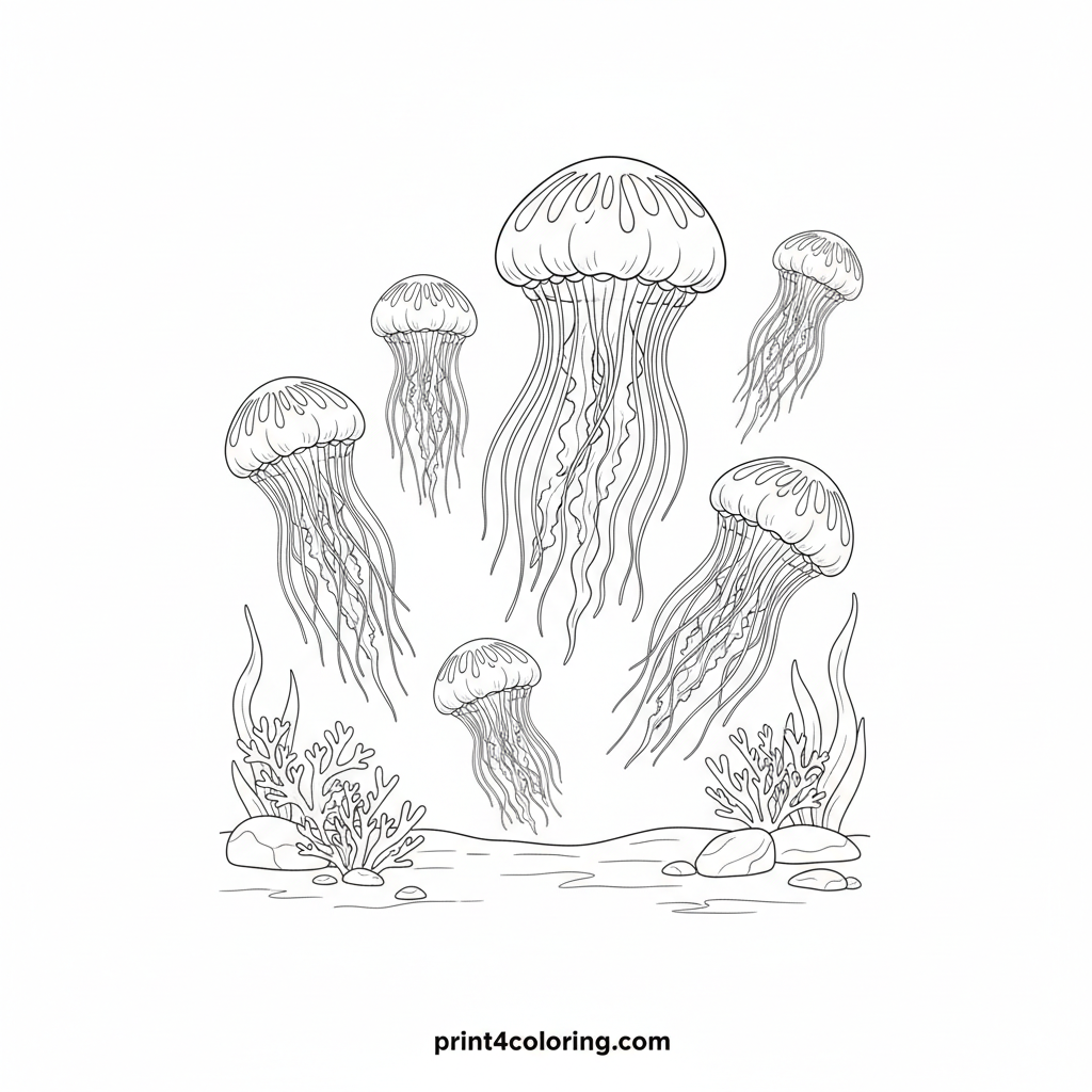 #jellyfish#bioluminescent#ocean#deep sea#underwater#glowing#sea life#marine animals#night scene#coral#expert#coloring-page#printable
