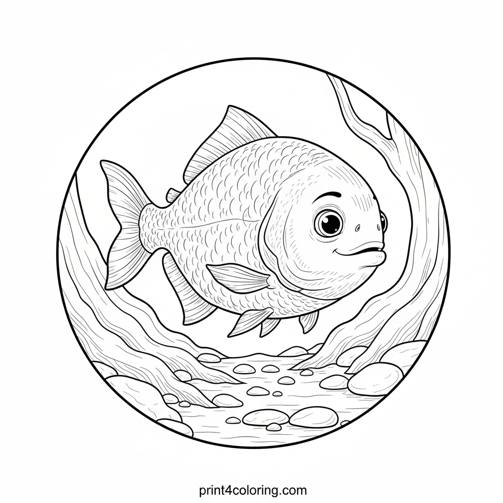 Dive into the serene underwater world with our elegant piranha, gracefully gliding through crystal-clear river water. This dynamic scene captures its sleek body, intricate scales, and fins propelling it past submerged roots and smooth riverbed pebbles. A perfect page to explore the beauty of river life and discover hidden details.
