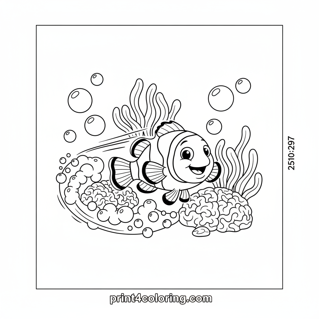 Dive into the ocean for an exciting bubble race! Our cheerful clownfish is having the time of its life, zooming through the water on a super-speedy stream of its own bubbles. With a big grin, it's ready to win this fin-tastic underwater adventure. Grab your colors and bring this vibrant scene to life!