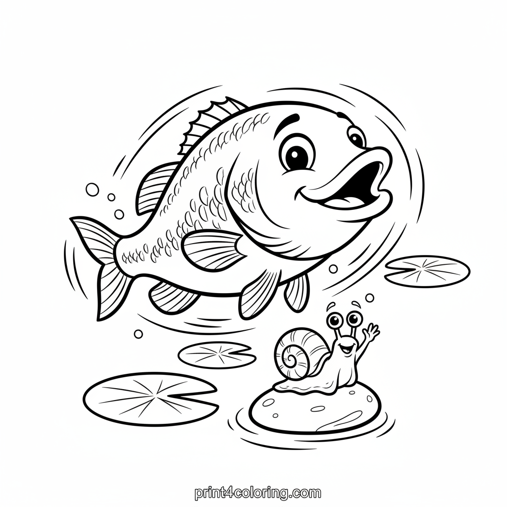 Dive into an underwater world with our friendly bass! This happy fish, with big, kind eyes, is gently swimming past beautiful lily pads and even a smiling snail. Explore the clear pond's gentle ripples and bring this serene aquatic scene to life with your favorite colors. A delightful adventure awaits!