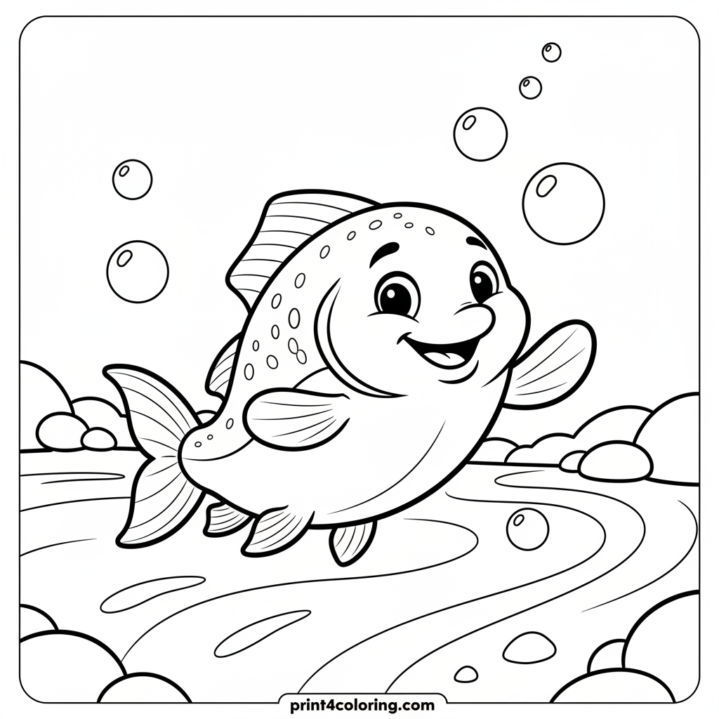 Dive into a bubbly river with our cheerful salmon friend! This happy fish has big, friendly eyes and is waving a fin just for you. Imagine the shimmering scales and sparkling water as you bring this fin-tastic scene to life with your favorite colors. A cozy underwater adventure awaits!