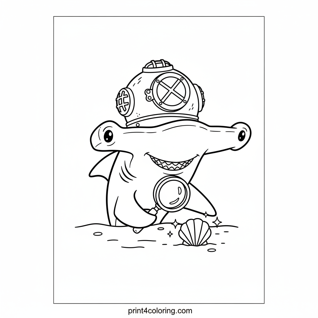 Dive into an underwater adventure with our friendly Hammerhead Explorer! He's wearing a super cool diving helmet and carefully examining a sparkling seashell with his magnifying glass on the sandy ocean floor. What amazing discoveries will this curious shark make today? Grab your crayons and bring this scene to life!