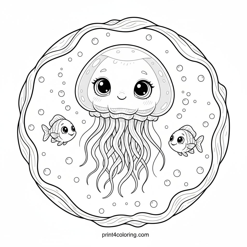 Explore a serene underwater world with this adorable baby jellyfish! Its soft, flowing tentacles gently drift through clear ocean water, surrounded by tiny, realistic bubbles. Friendly little fish swim nearby, observing its peaceful dance. Add vibrant colors to its delicate form and the calming deep-sea environment for a relaxing coloring adventure!