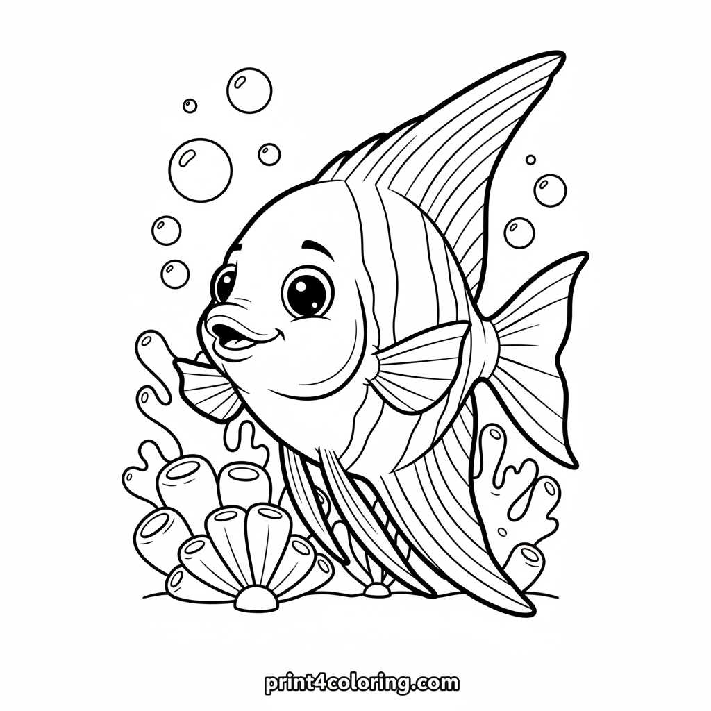 Dive into a delightful underwater world! This coloring page features a magnificent angelfish with long, flowing fins, gracefully gliding through a serene, bubbly ocean scene. Explore friendly coral shapes and bring this close-up portrait to life with your favorite colors. Perfect for a relaxing creative adventure!