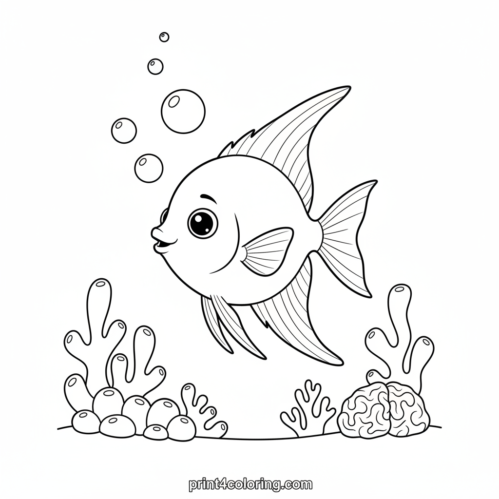 Dive into an enchanting underwater world with a graceful angelfish! Watch as its long, elegant fins gently sway through a bubbly ocean scene, surrounded by simple, friendly coral shapes. This cute and cozy adventure invites you to add vibrant colors to its serene aquatic home.