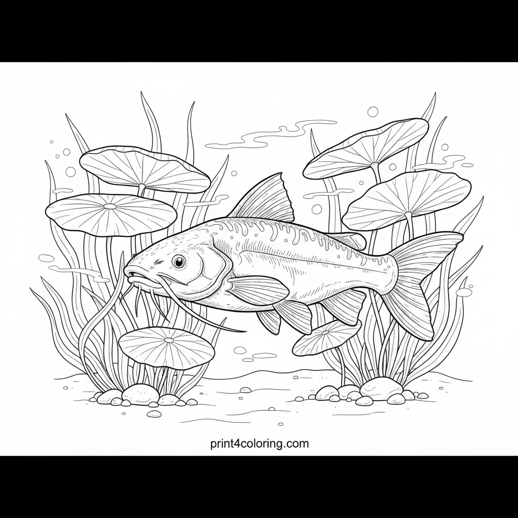 Dive into an expert coloring challenge! A magnificent catfish gracefully glides through a detailed underwater garden of eelgrass and water lilies. Its elegant fins are spread wide, showing its movement through gentle water currents. Use intricate colors and shading to bring this dynamic aquatic scene to vibrant life!