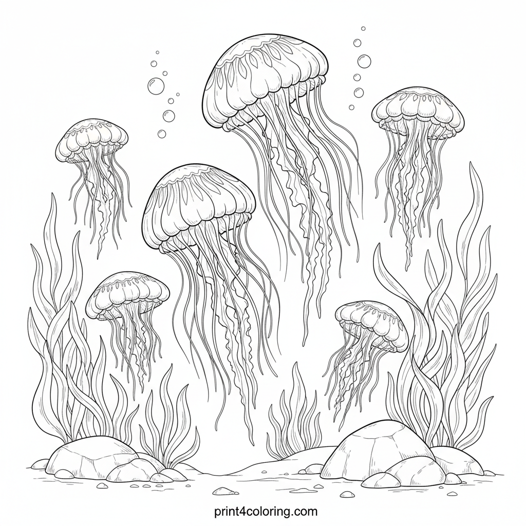 #jellyfish#underwater#ocean#marine-life#kelp-forest#sea-creatures#detailed#expert#coloring-page#printable