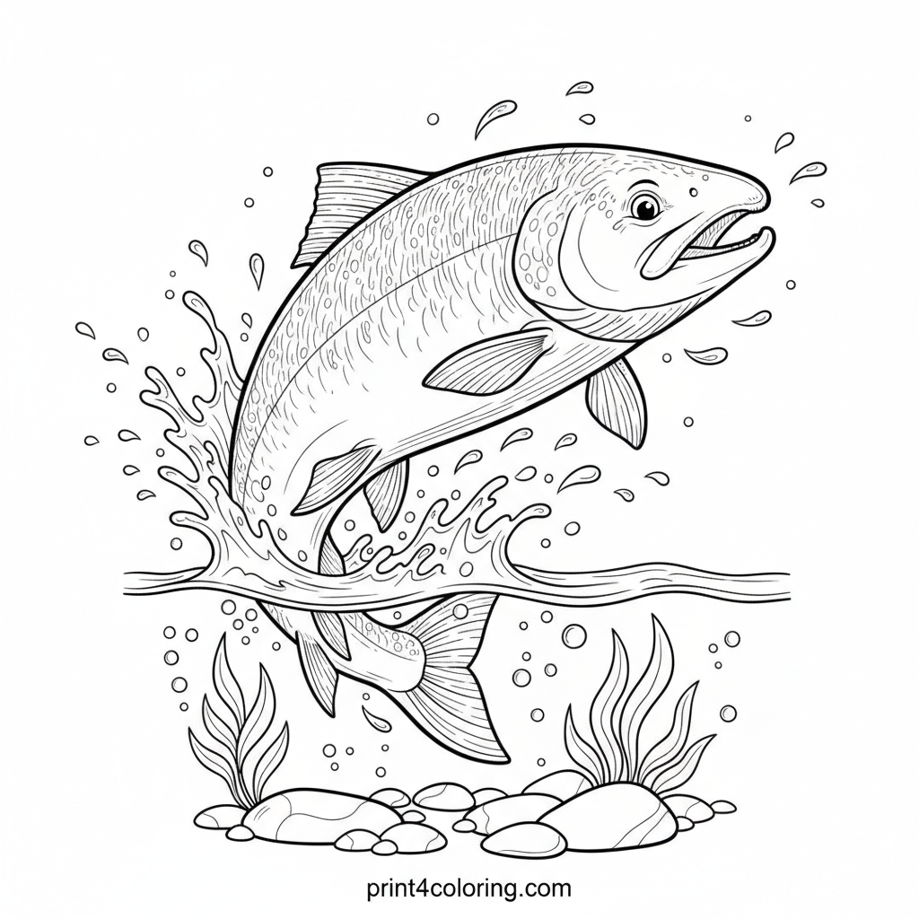 Dive into the vibrant world of a friendly river salmon! This detailed coloring page captures a healthy adult salmon mid-glide, showcasing its beautiful textured scales and gentle expression. Surrounded by smooth river stones and delicate aquatic plants in crystal-clear water, it invites you to bring its underwater journey to life with your most vivid colors.
