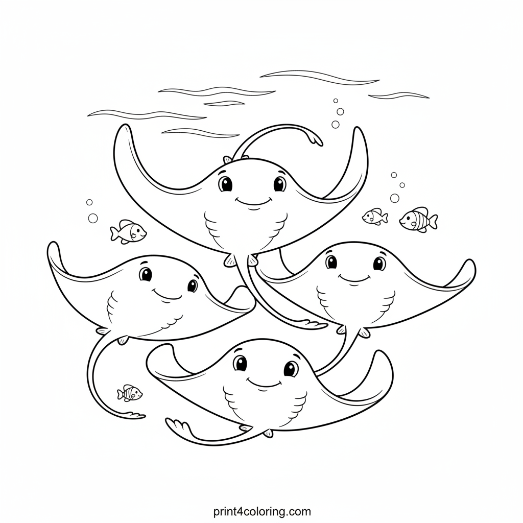 Dive into an enchanting underwater world with this graceful coloring page! Watch three magnificent stingrays perform a silent ballet, their flowing fins creating elegant swirls. Gentle waves undulate in the background, accompanied by a few curious fish. Bring this mesmerizing ocean scene to life with your favorite colors!