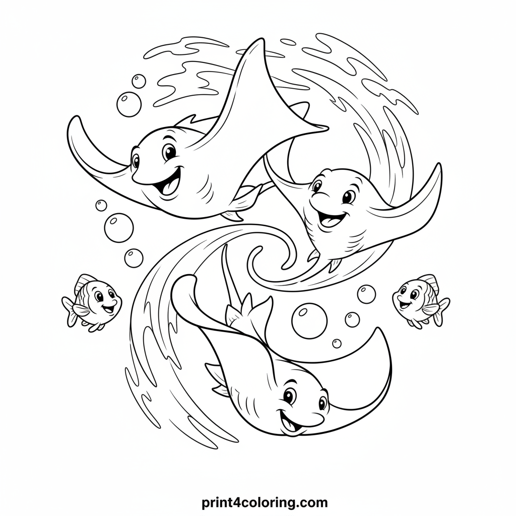 Immerse yourself in an enchanting underwater world! This coloring page features three magnificent stingrays performing a graceful ballet, their elegant fins flowing like capes as they swirl through gentle ocean currents. Friendly little fish add to the magic. Bring this beautiful ocean dance to life with your favorite colors!