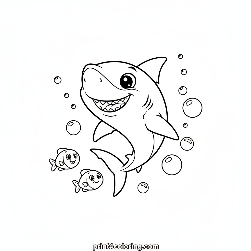 Dive into an enchanting underwater world with our happy baby shark! Watch as this adorable little great white, with its big friendly eyes and a cheerful smile, embarks on its very first swim. Surrounded by gentle bubbles and curious, colorful fish, this scene is perfect for young artists to bring to life.