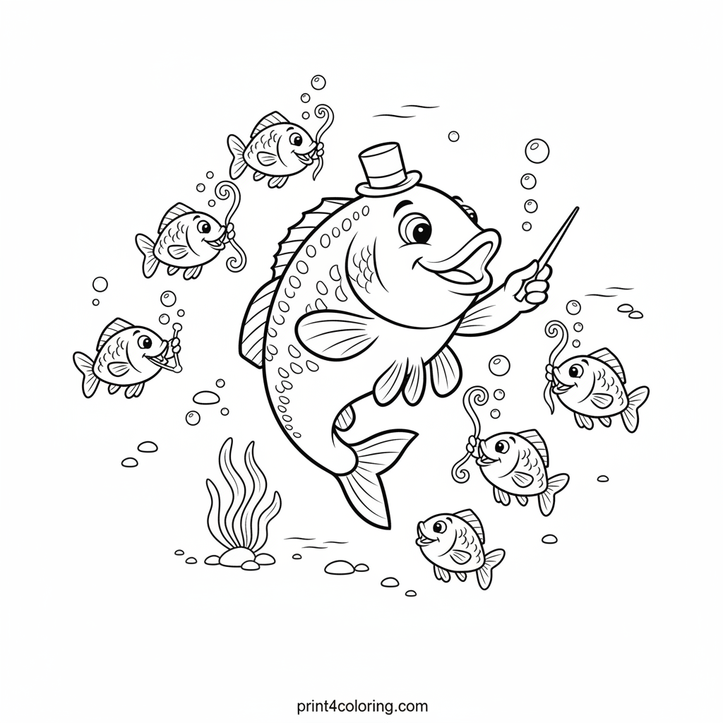 Dive deep into a whimsical underwater concert! Our magnificent bass conductor, sporting a tiny hat and baton, leads a lively orchestra of friendly minnows. Watch as they create beautiful melodies with seaweed instruments and bubbly beats. A delightful scene for budding artists to bring to life with vibrant colors!