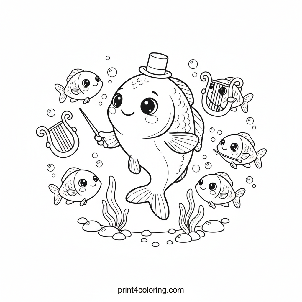 Dive into a whimsical underwater world where Maestro Bass, in his tiny hat, leads a joyful symphony! Watch as he guides his fishy orchestra, playing instruments made of swaying seaweed and shimmering bubbles. This cute and cozy scene is perfect for little artists to bring to life with vibrant colors. Get ready for a splash of creativity!