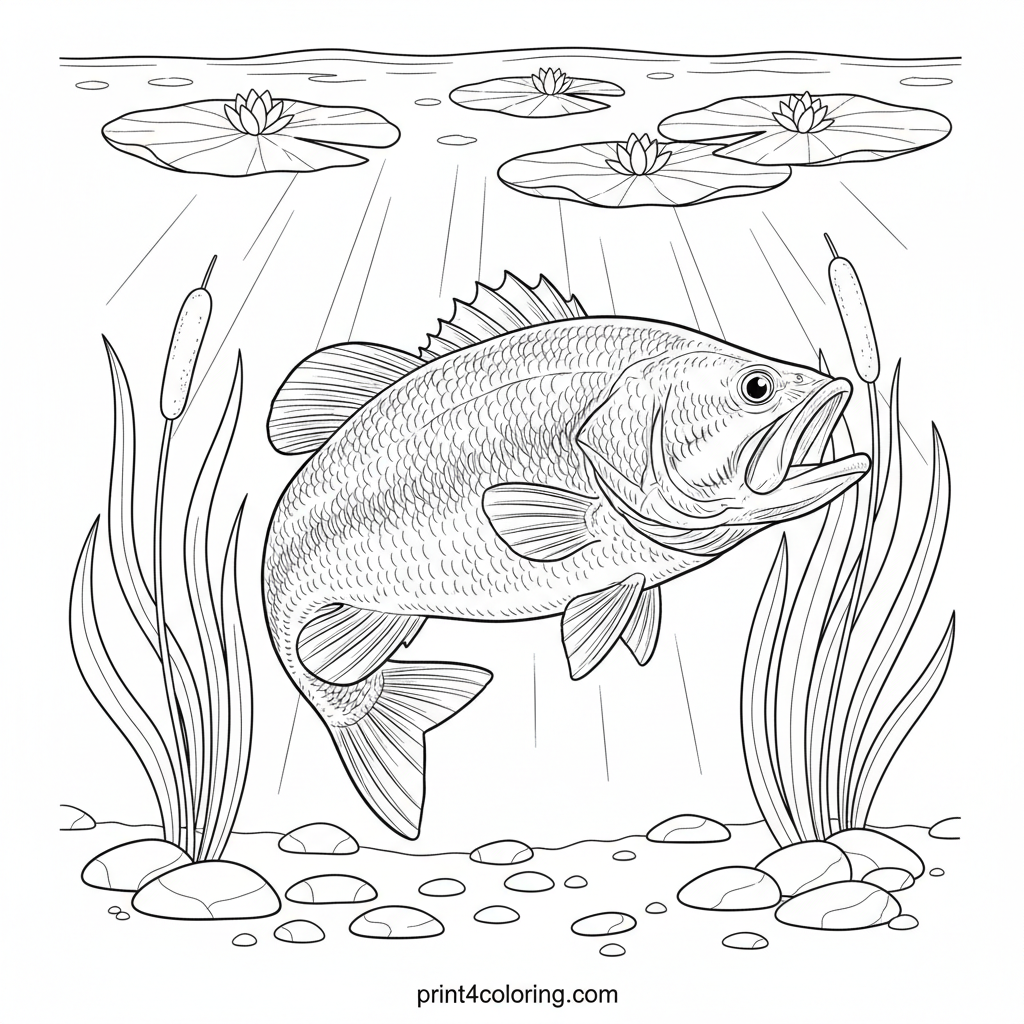 Dive into a detailed underwater world with this majestic largemouth bass. Its intricate scales and fins shimmer as it glides through lush aquatic plants, including cattails and lily pads. Smooth riverbed stones and gentle light rays complete this serene scene, waiting for your expert touch.