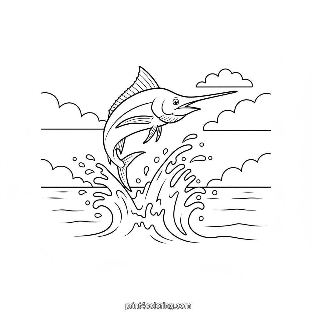 Leap into the ocean's excitement! This coloring page captures a magnificent marlin soaring through the air, having just burst from the sparkling waves. Imagine the cool spray and the vast blue sky as you bring this powerful fish to life with your favorite colors. A thrilling scene for all young artists to explore!